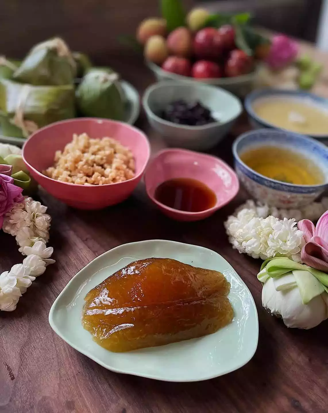 Không giống với bánh tro ở các nơi khác, bánh tro Đình Tổ có màu sắc trong suốt như hổ phách, độc đáo và cầu kỳ từ cung cách chế biển đến thưởng ngoạn.